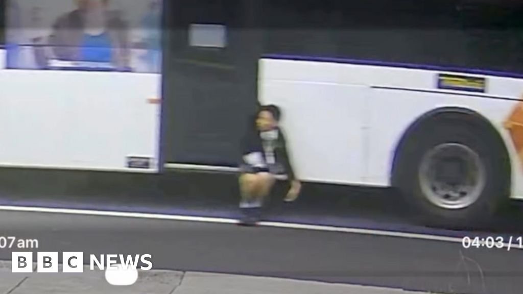 CCTV footage shows a boy dangling from the rear doors of a moving bus in Melbourne, Australia.